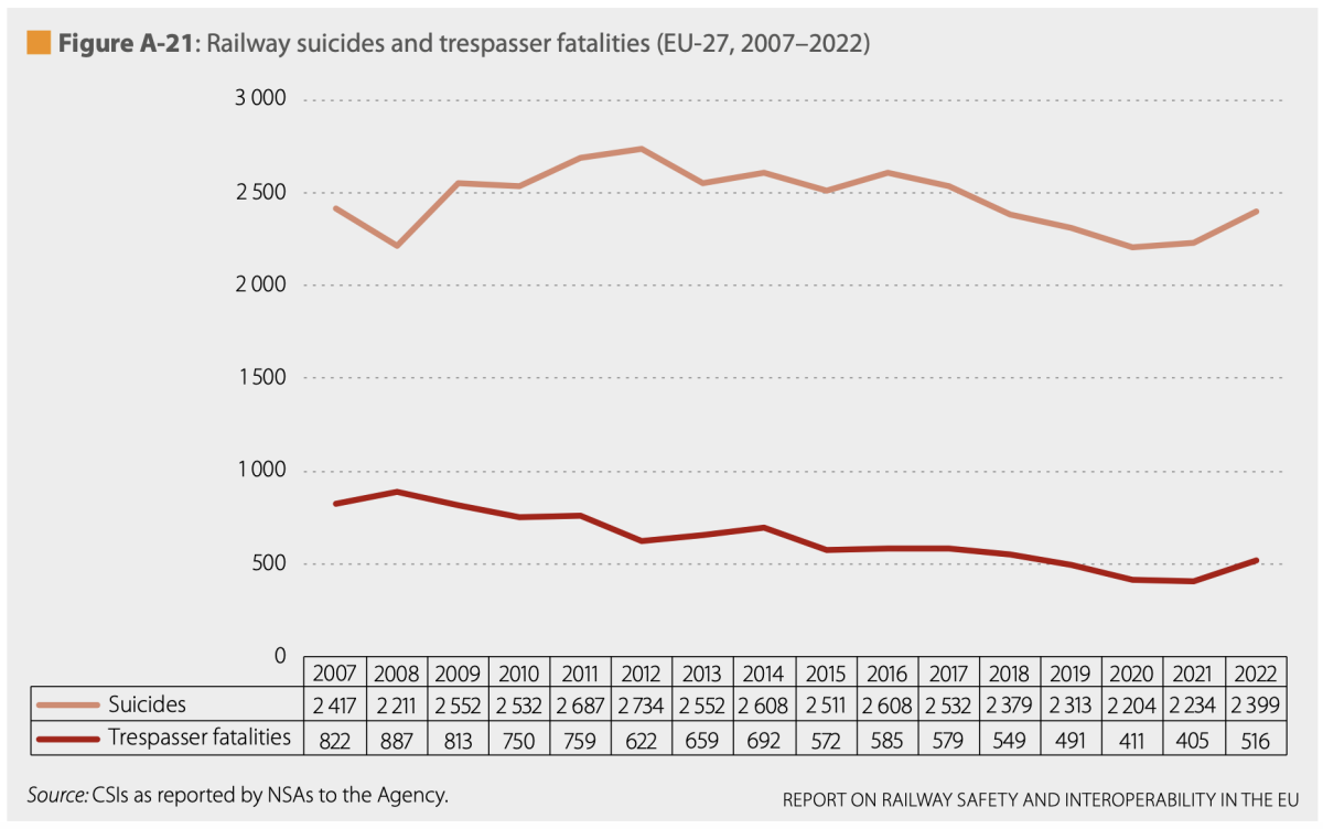 Suicides are reported separately from accident fatalities. They represent more than 75% of all fatalities on railways. On average, about six suicides are recorded every day on railways in the EU.